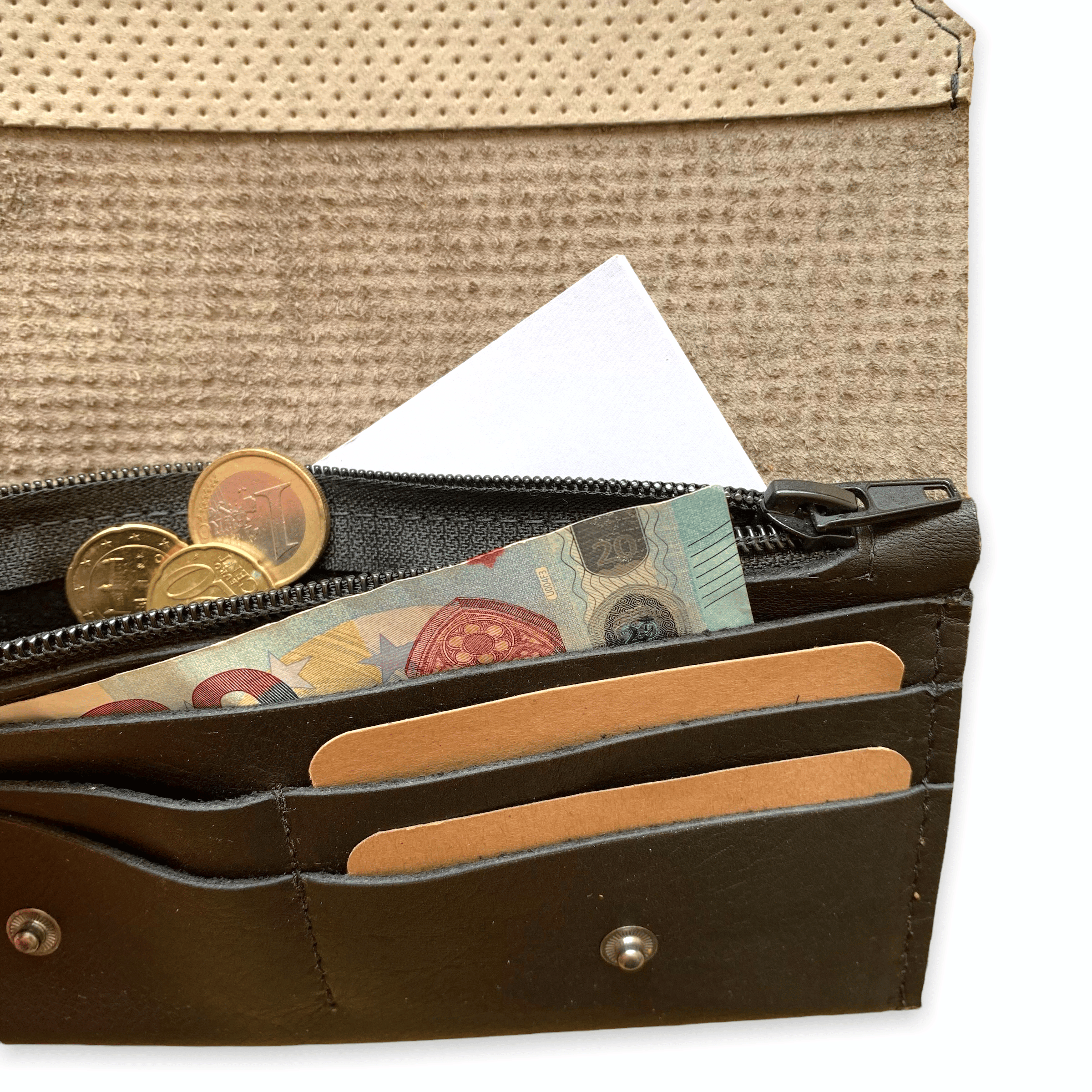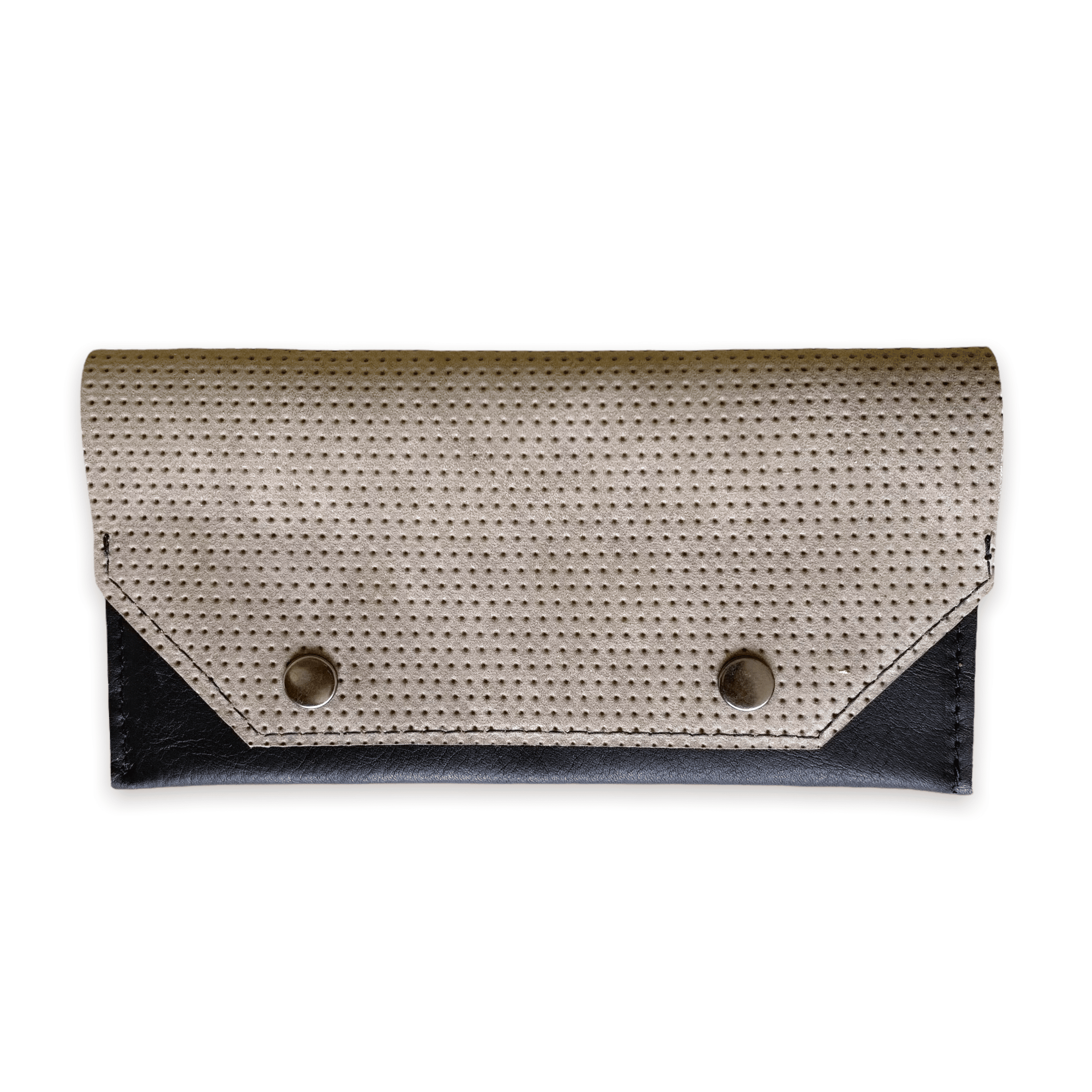 • De portemonnee sluit aan de voorkant met een twee drukknopen.