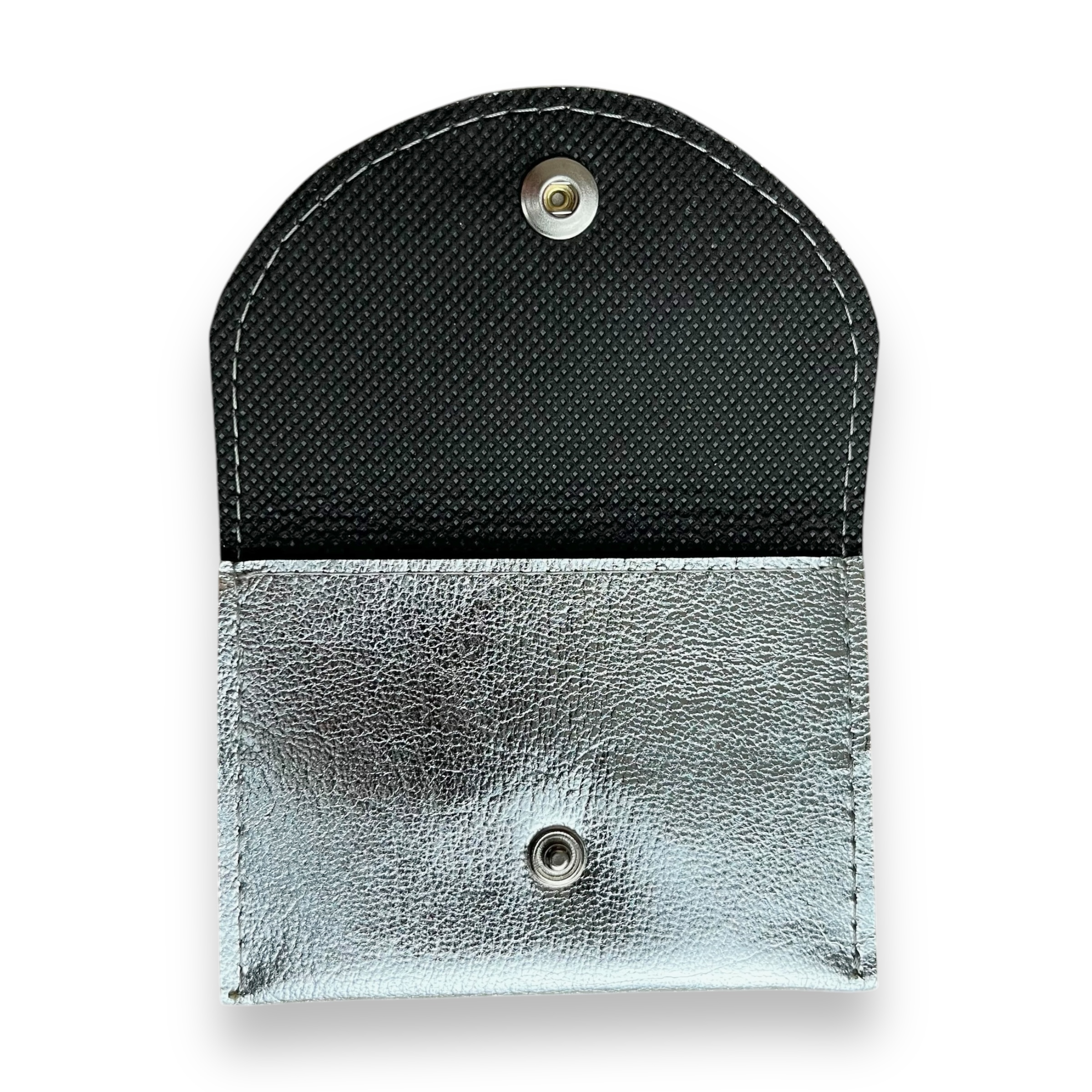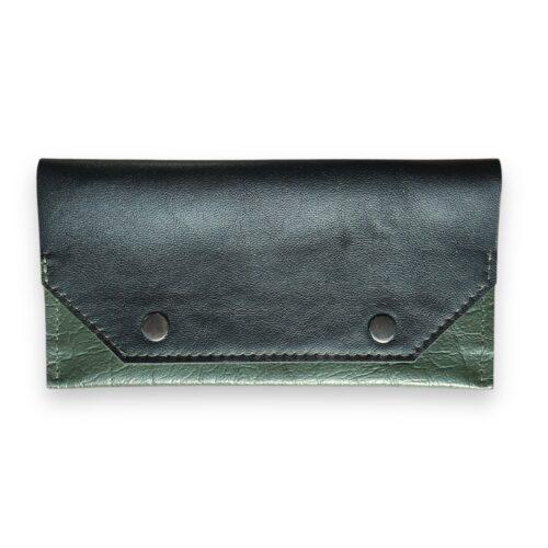 - De portemonnee sluit aan de voorkant met een drukknoop.