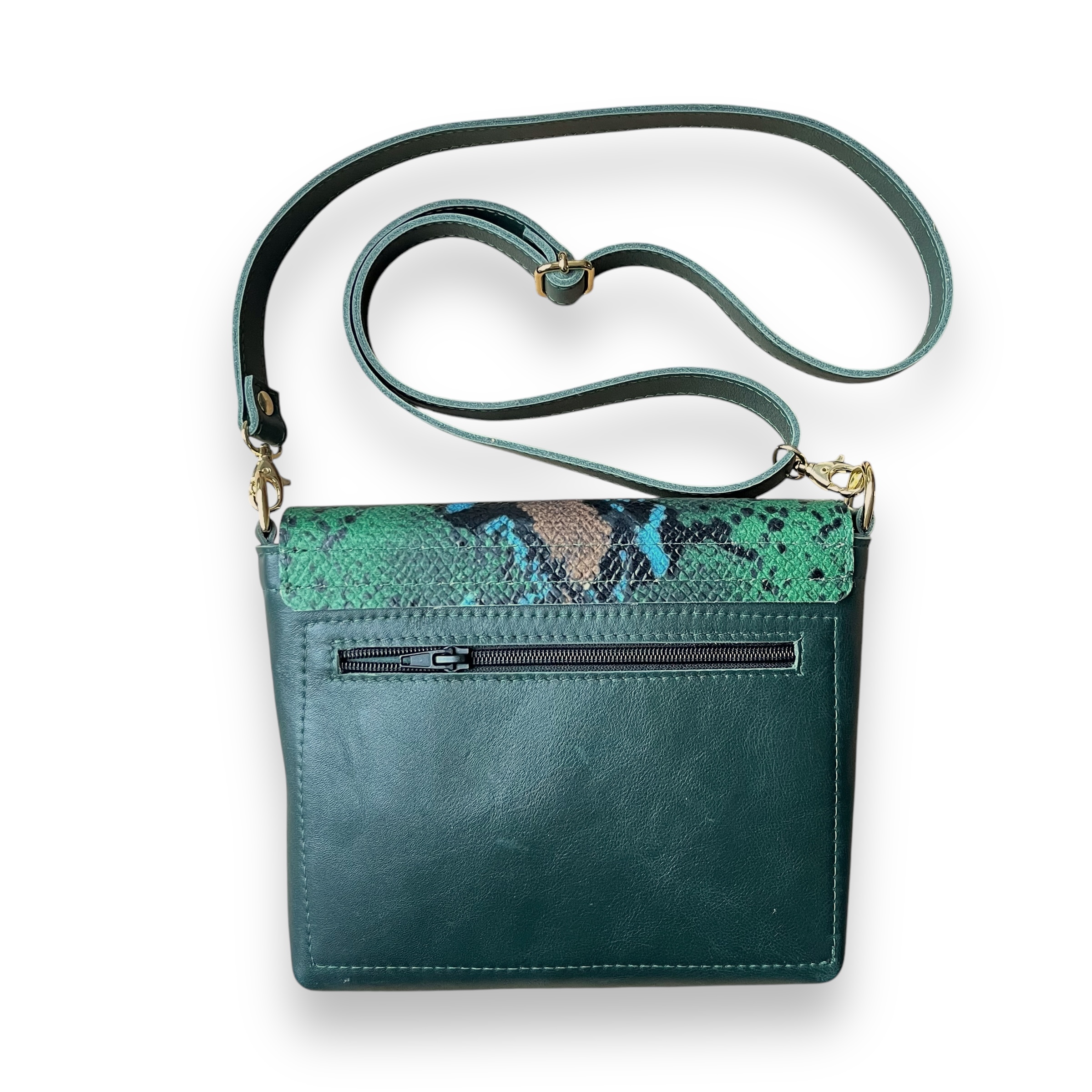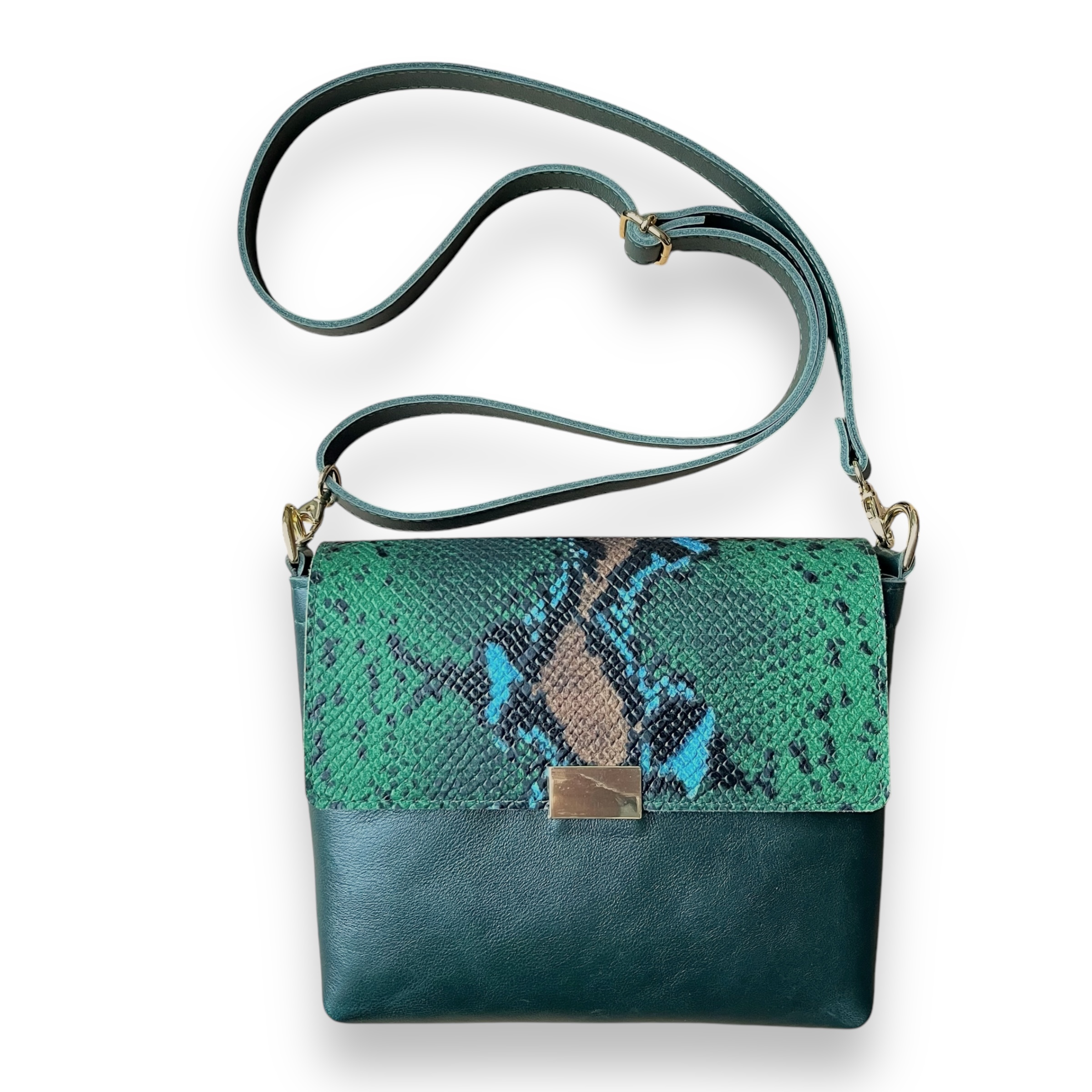 - Kleur | materiaal: donker groen, snake groen reliëf | stevig leer.
